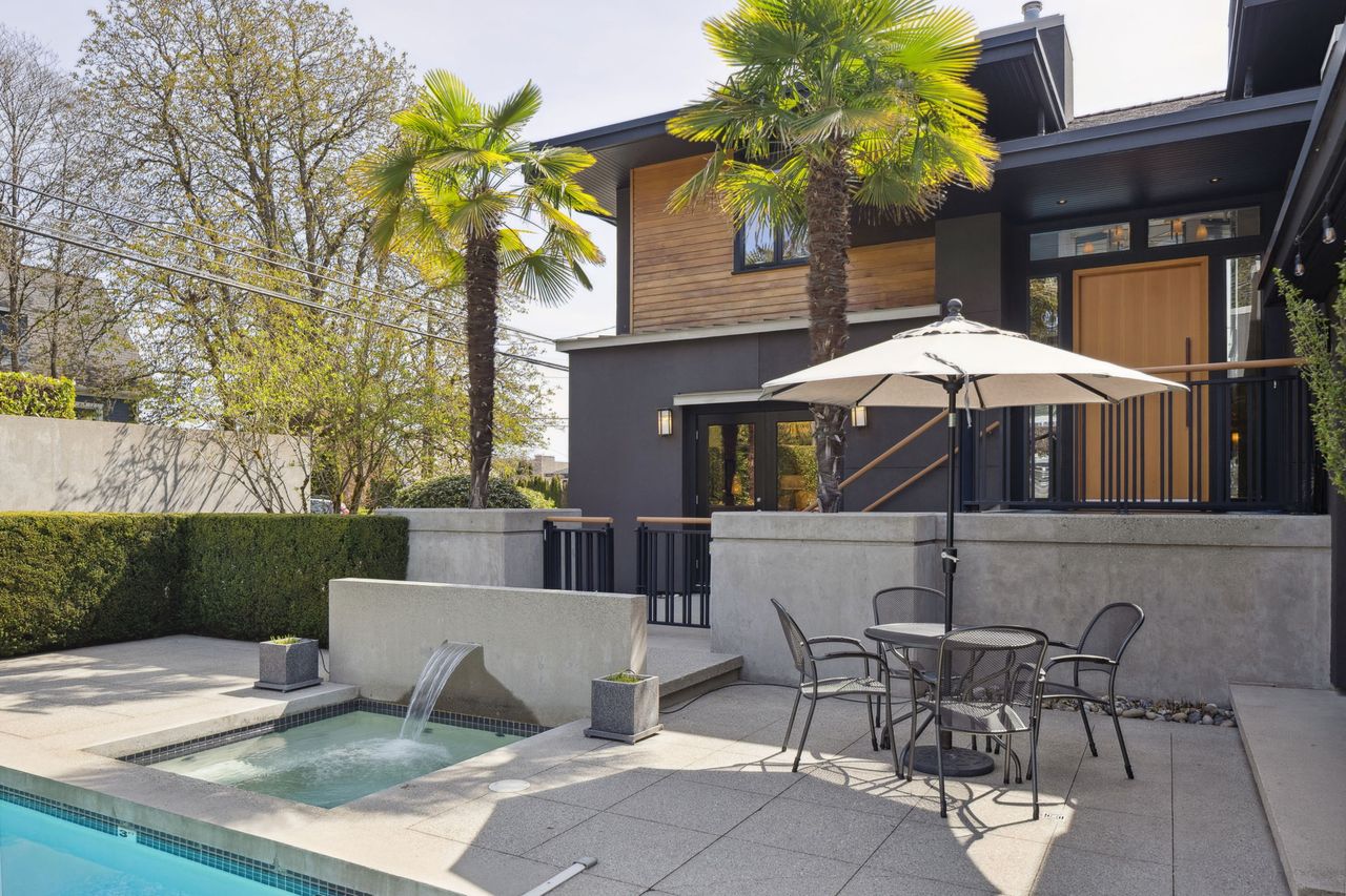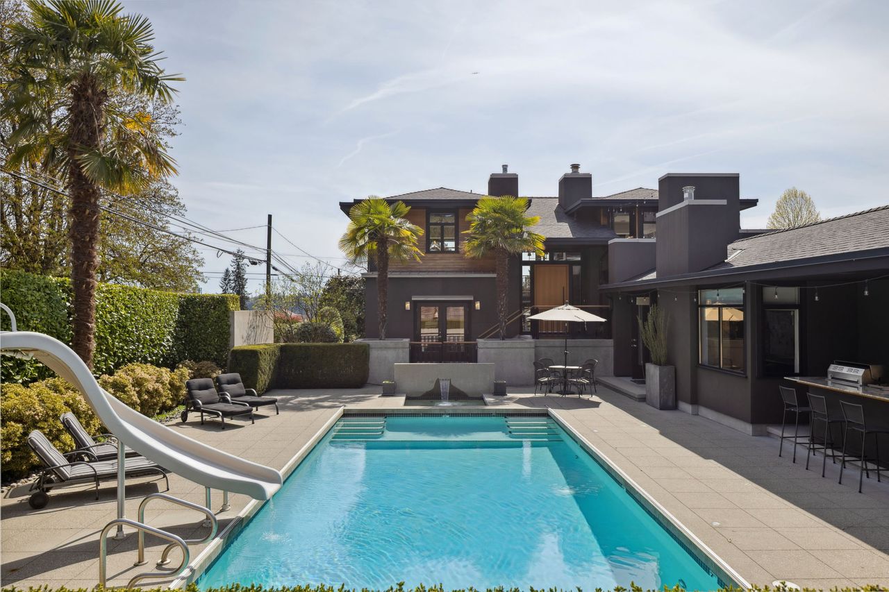 A rare opportunity in Ambleside—this custom-built contemporary home, designed by architect John Dow Medland, is perfectly positioned on a flat, 70x150 ft sub dividable lot. The residence is a true blend of form and function, with features including air conditioning, geothermal heating and cooling, Nuheat bathroom floors, built-in vacuum with kick vents, and a 16x32 ft pool. Inside are three spacious bedrooms, four bathrooms, 4 gas fireplaces and a brand new one-bedroom garden suite complete with high end finishings and appliances. Intentional design features include hardwood throughout, high-end appliances, and a covered outdoor kitchen. Complete with security system and irrigation, this home offers refined West Vancouver living just minutes from the beach & Ambleside Village.