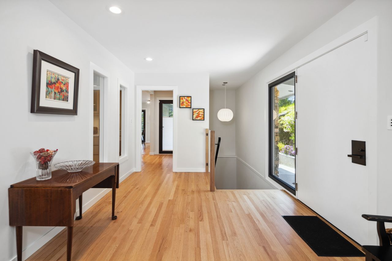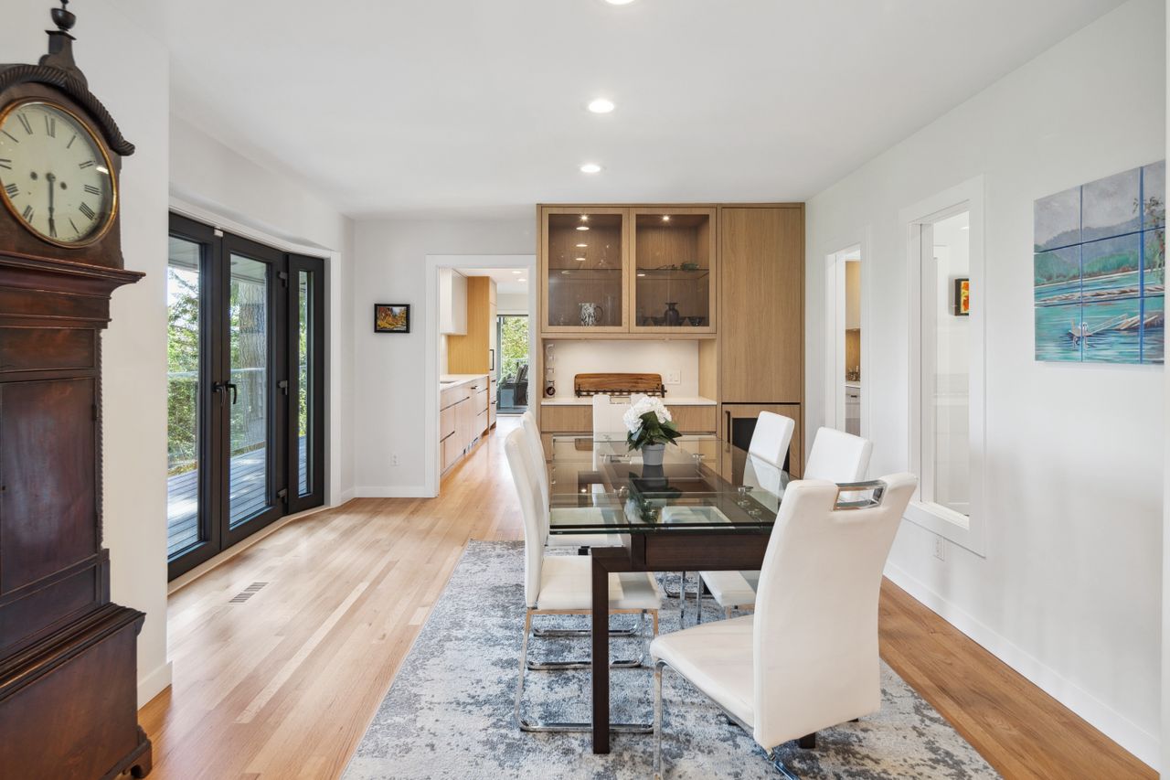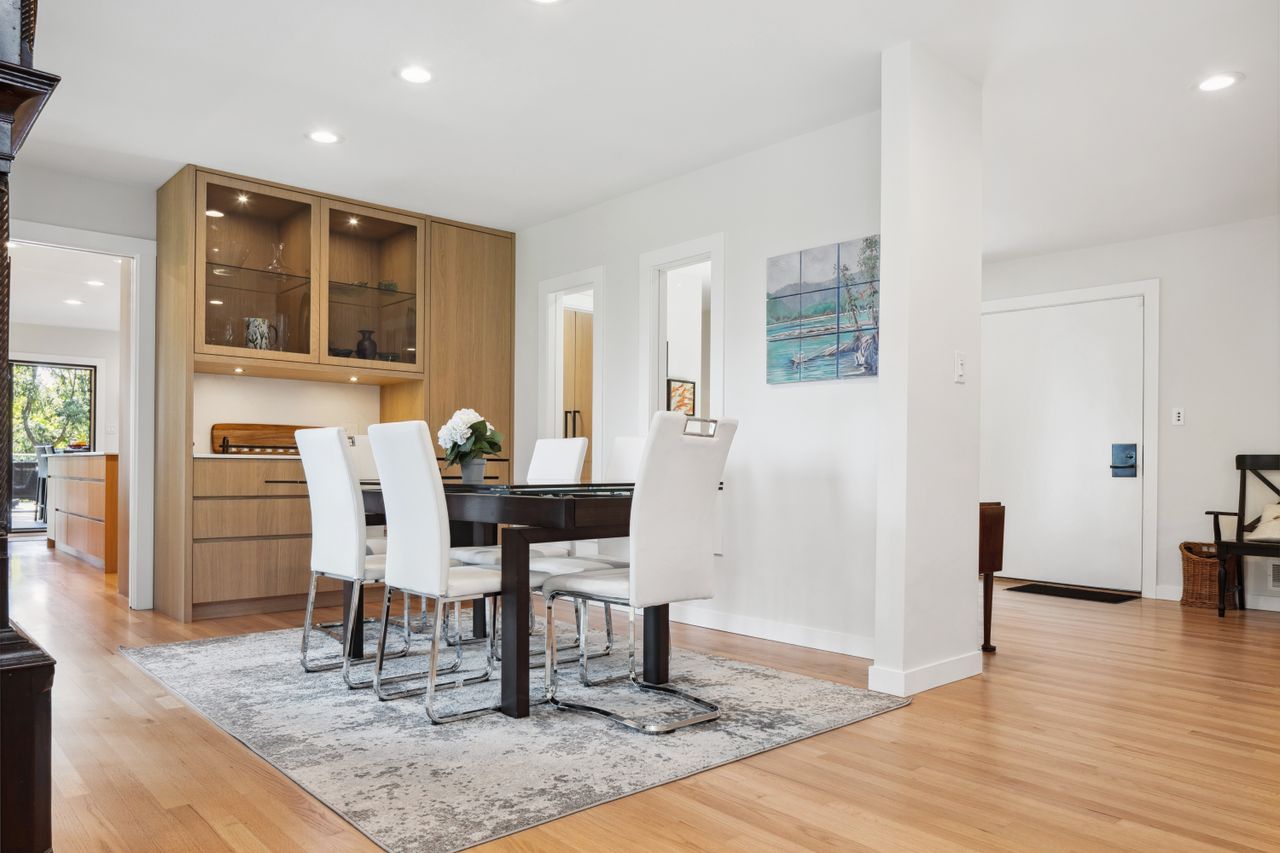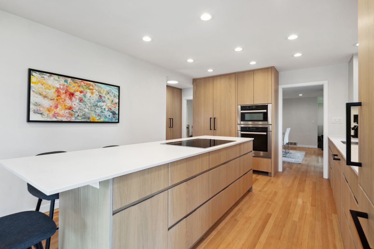 Extensively renovated between 2021 and 2024, the home features four bedrooms plus a flexible fifth, three bathrooms, and an open layout. The main level includes a formal dining area, a generous living room, and a stunning kitchen with Shinnoki Ivory Oak cabinetry, Miele appliances, and white suede quartz countertops.
