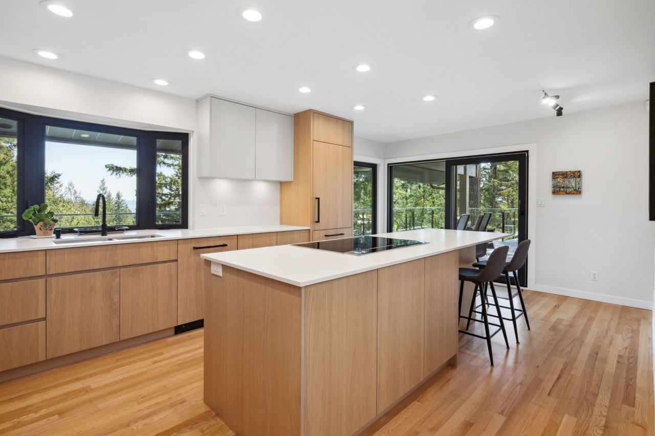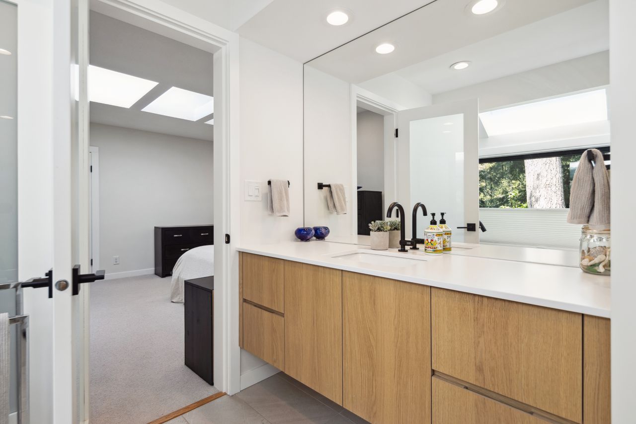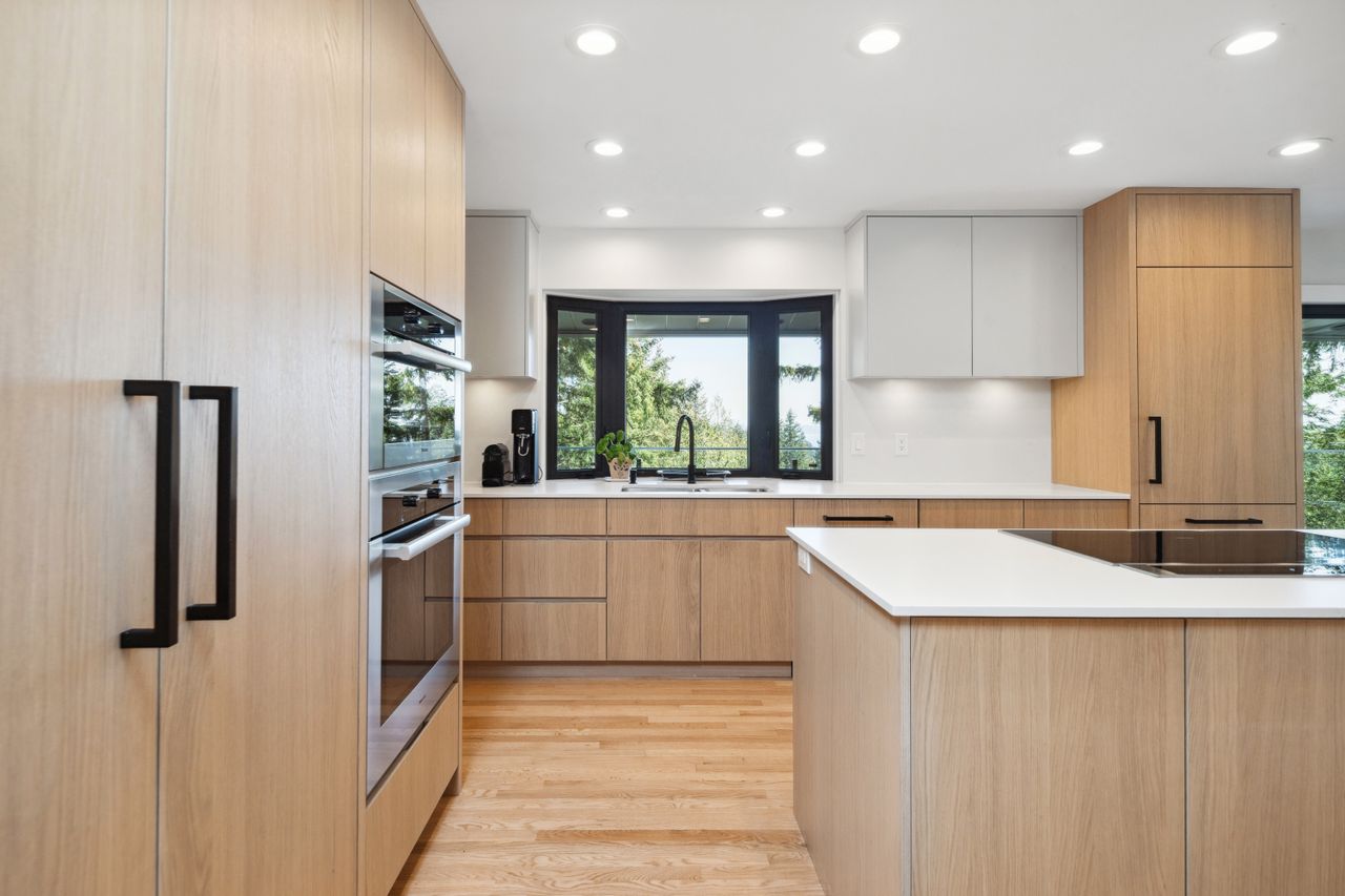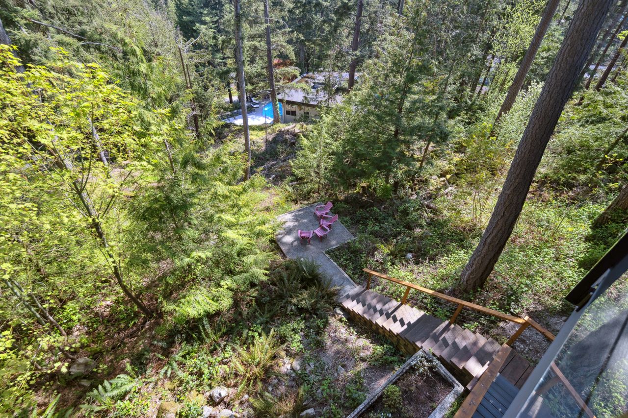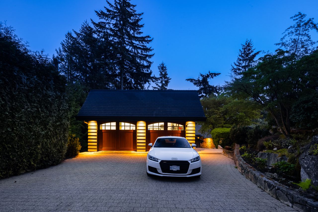 Tucked at the end of a quiet cul-de-sac and backing onto Westridge Park, this private half-acre estate in West Vancouver offers a rare combination of space, seclusion, and refined design. The driveway leads to a detached garage with an adjoining workshop and home office, while the main residence sits further back, surrounded by mature trees and partial ocean views toward downtown Vancouver.