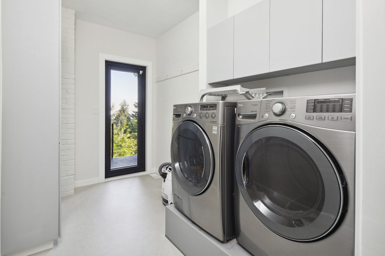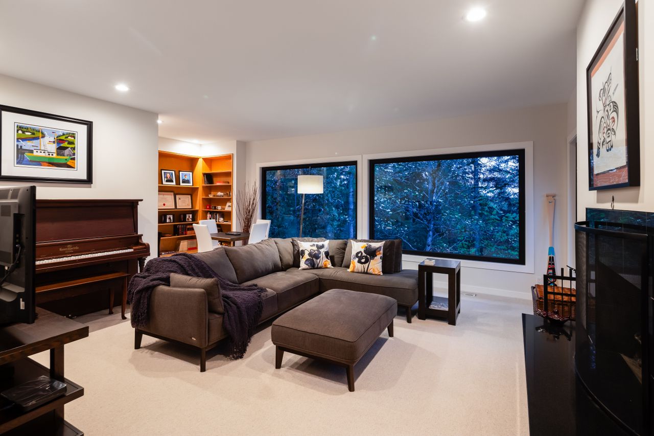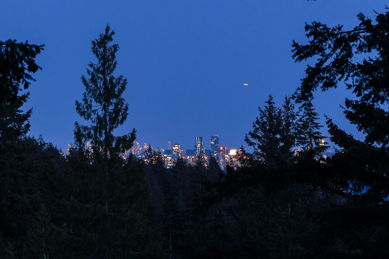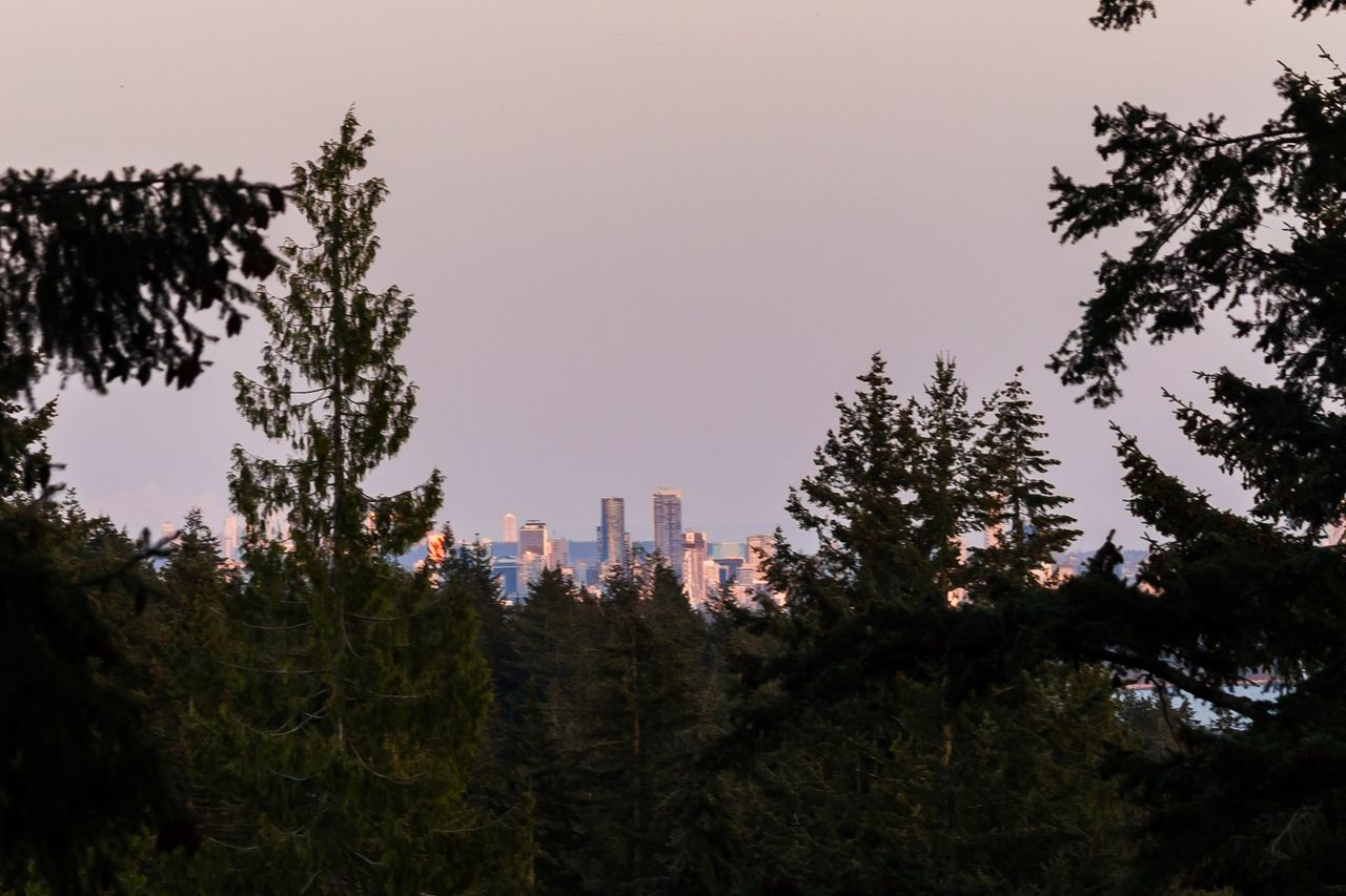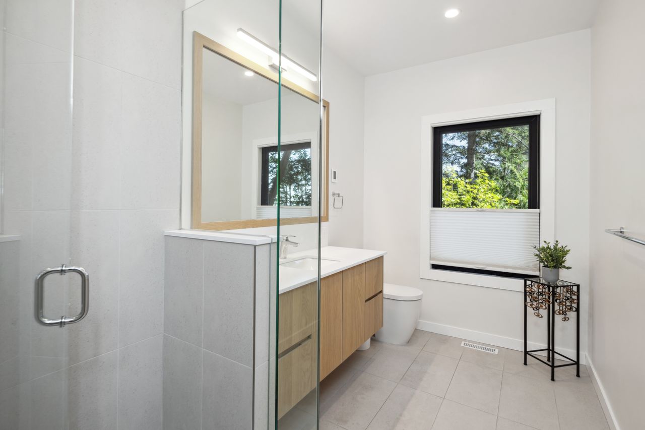 Tucked at the end of a quiet cul-de-sac and backing onto Westridge Park, this private half-acre estate in West Vancouver offers a rare combination of space, seclusion, and refined design. The driveway leads to a detached garage with an adjoining workshop and home office, while the main residence sits further back, surrounded by mature trees and partial ocean views toward downtown Vancouver.