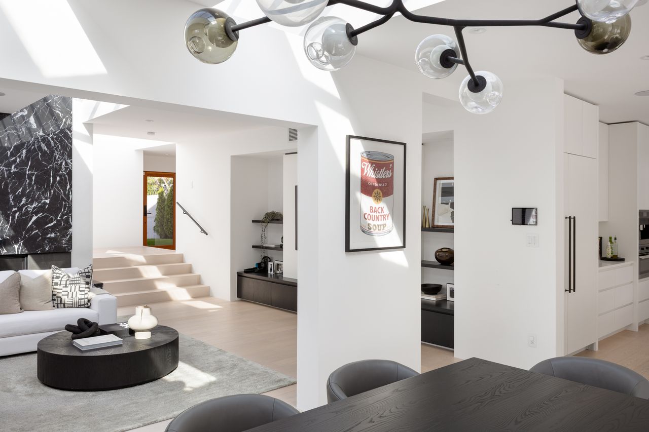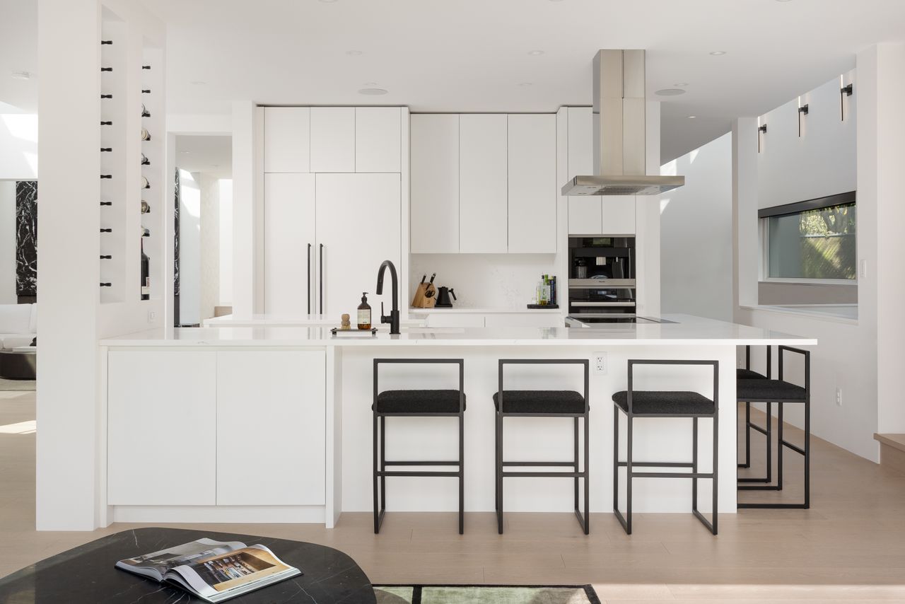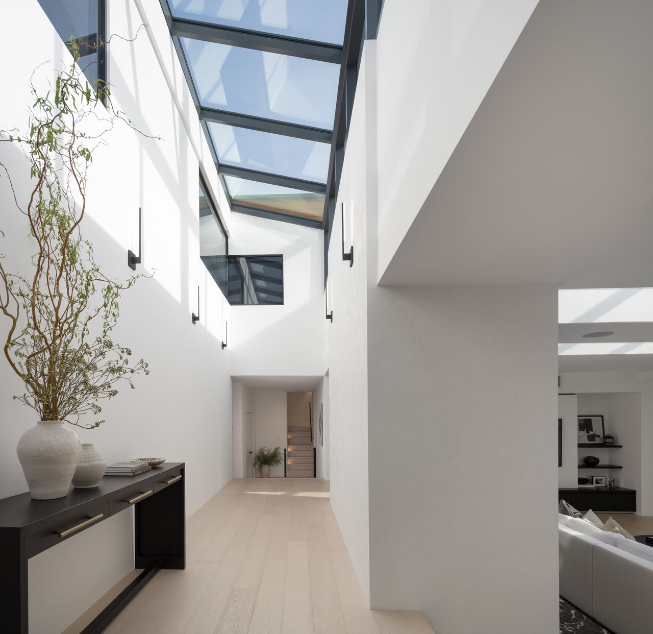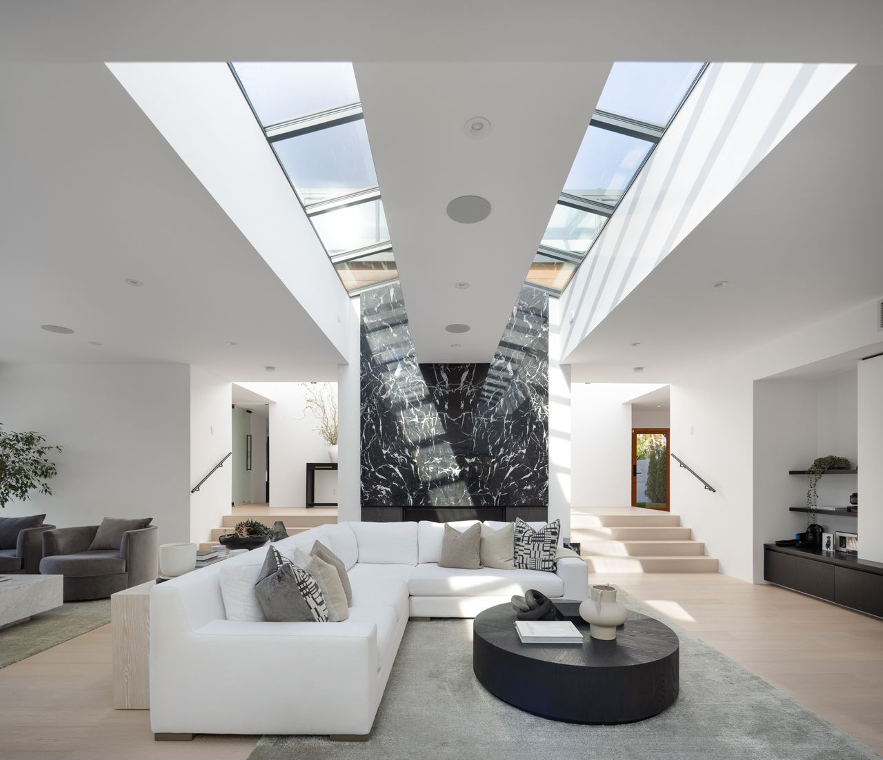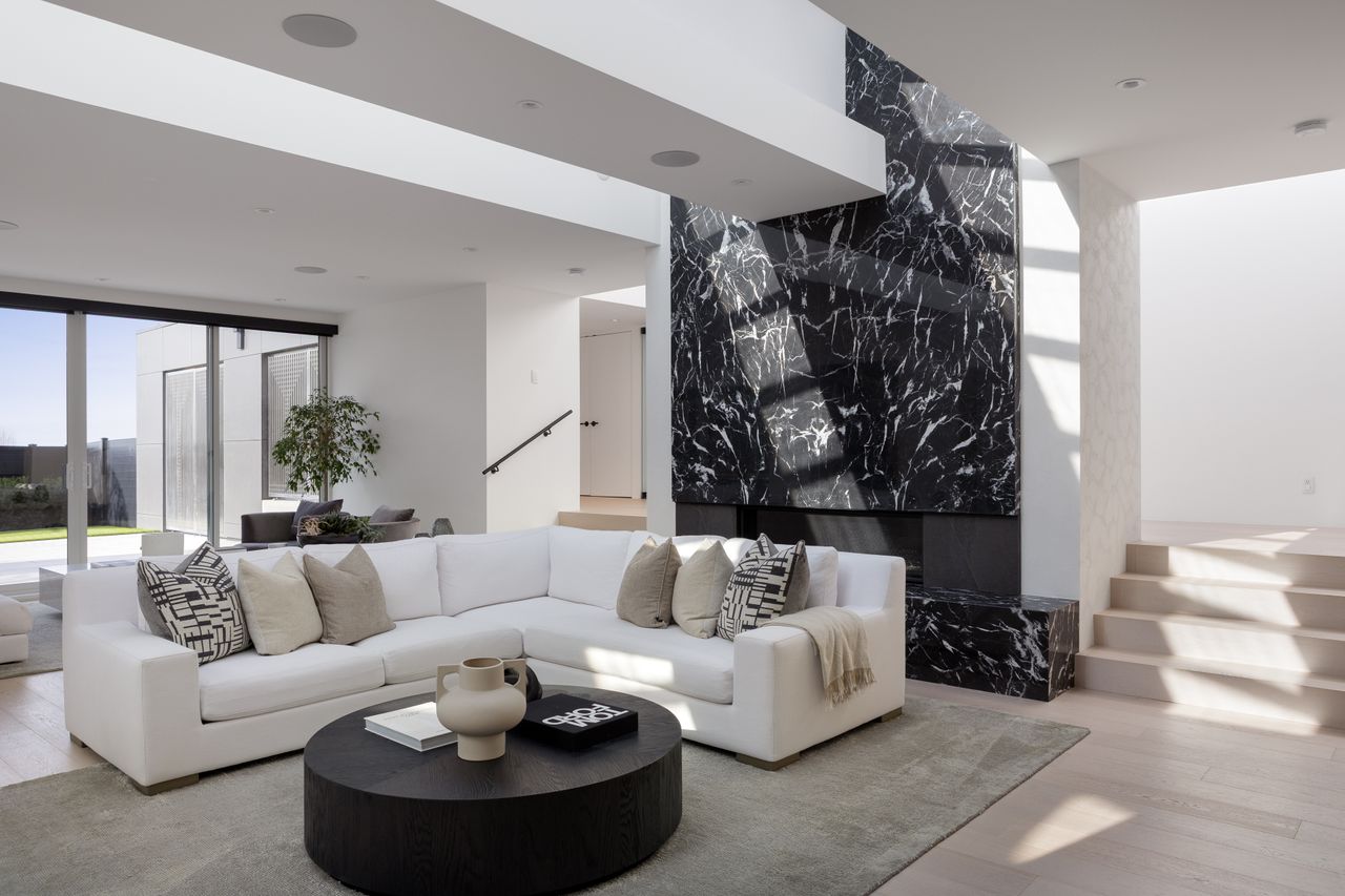 Inside, refined interiors are defined by Venetian plaster walls, skylit corridors, and a dramatic twenty-foot marble fireplace. A reimagined chef’s kitchen with Caesarstone counters, integrated appliances, and custom millwork opens directly to sun-drenched terraces, creating a seamless flow between indoor and outdoor living.