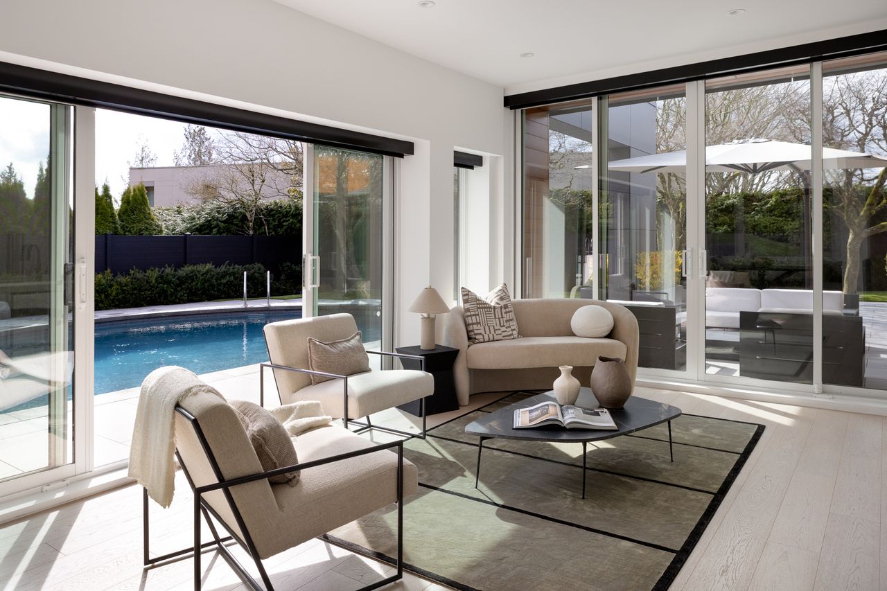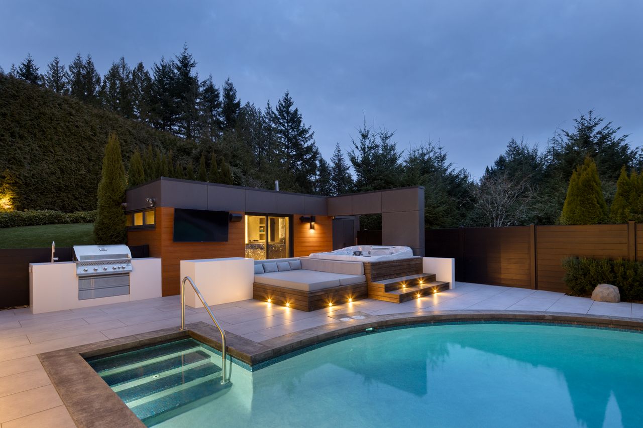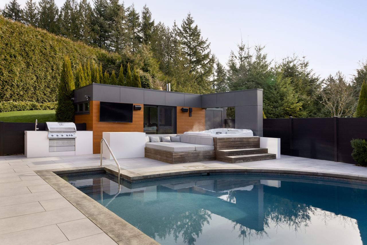 Outdoors, the residence transforms into a private resort. A sculptural pool, hot tub, outdoor kitchen, and cabana with marble interiors, steam room, and shower combine to create a setting for relaxation and entertaining unlike any other.