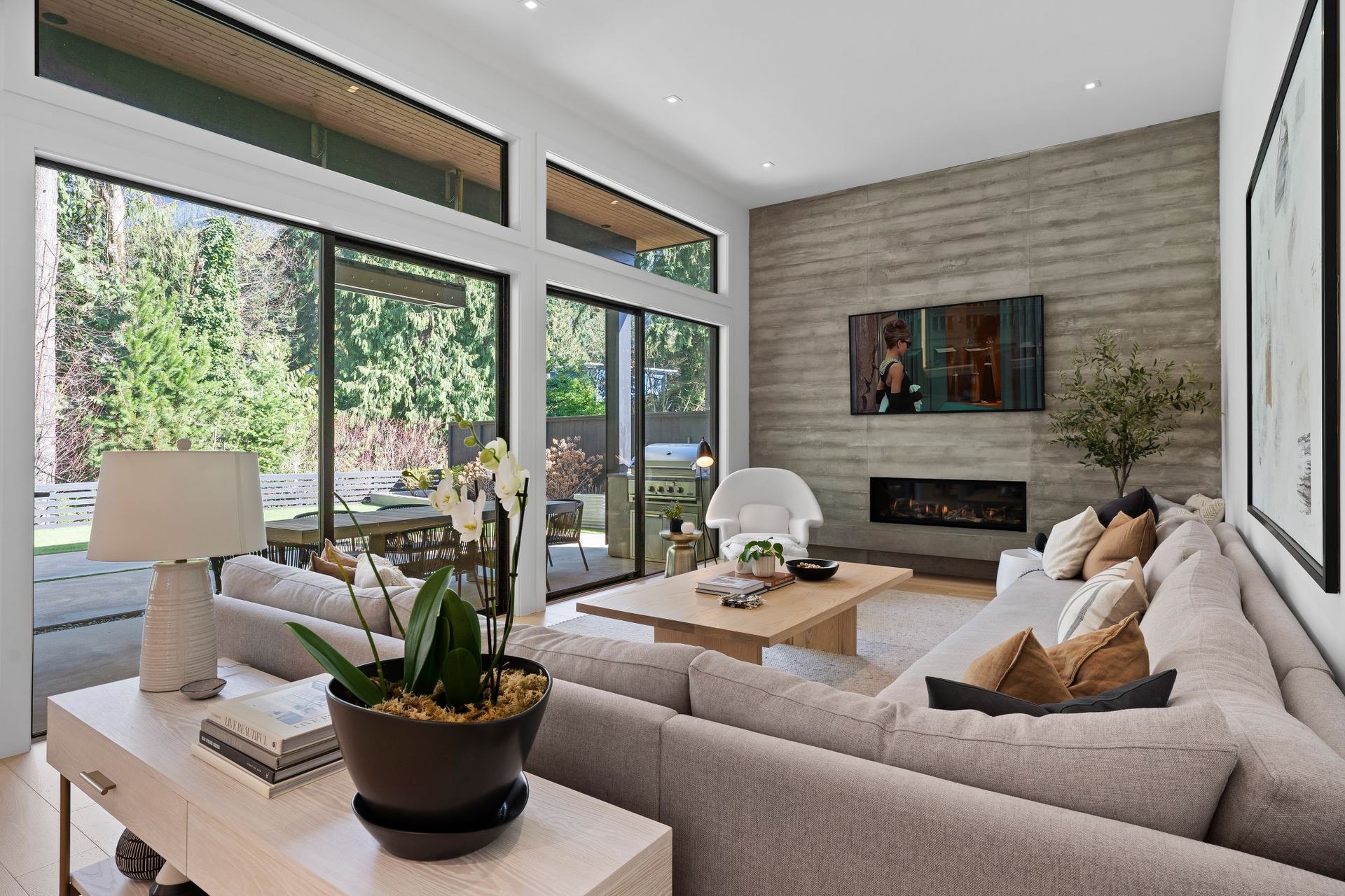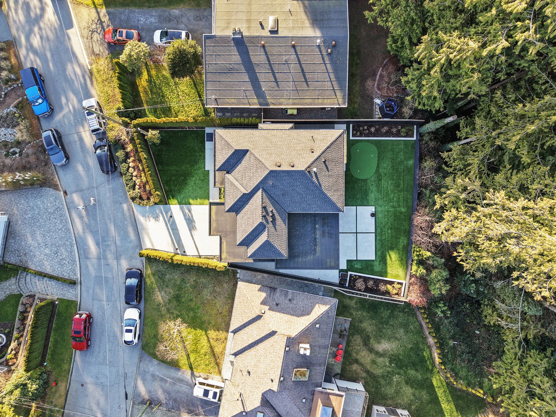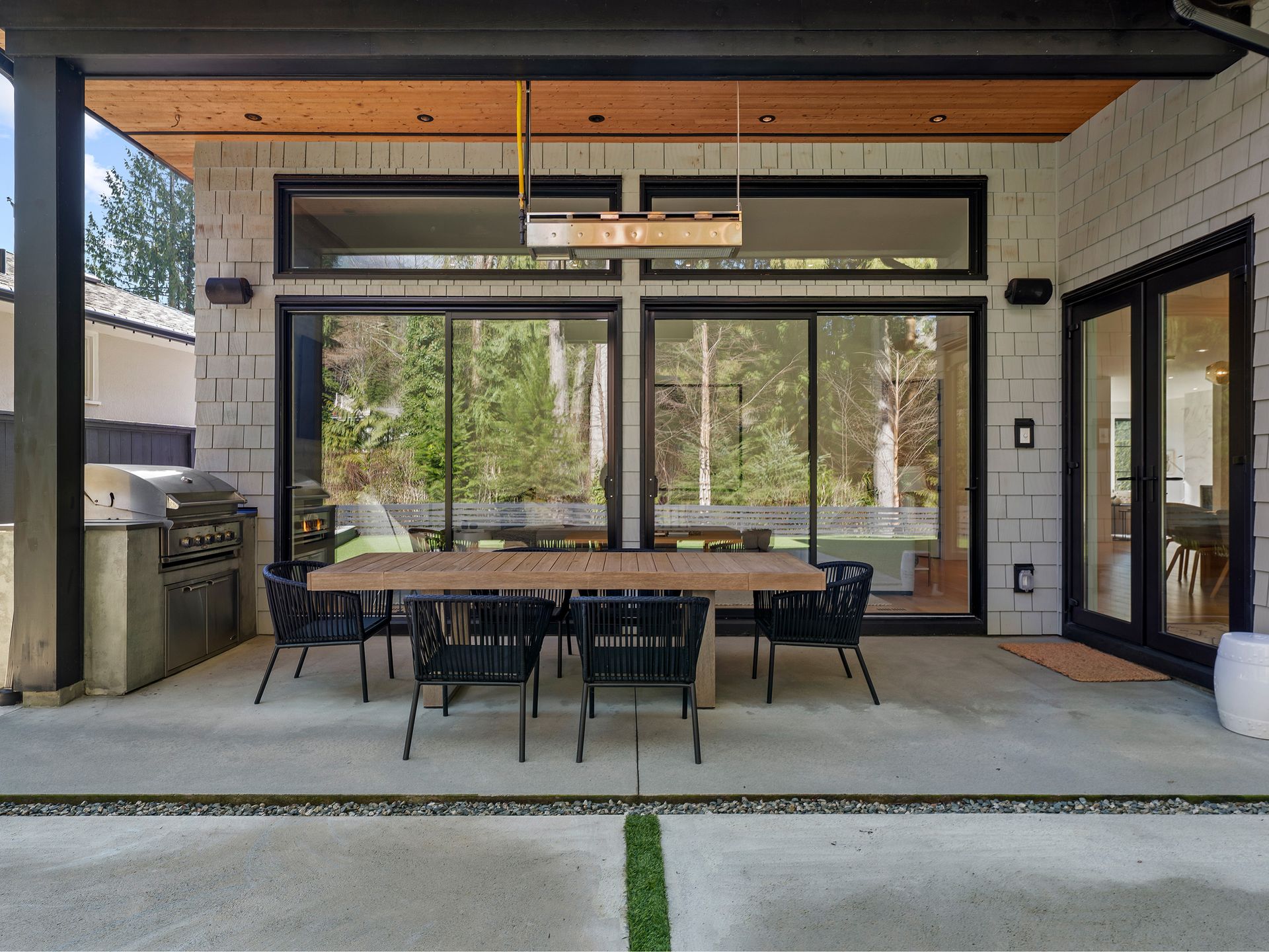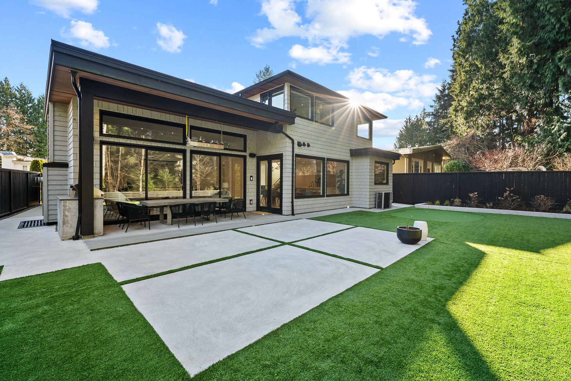 The exterior was designed for zero-maintenance, beautiful lighting, artificial turf (putting green), and extensive use of architectural concrete.