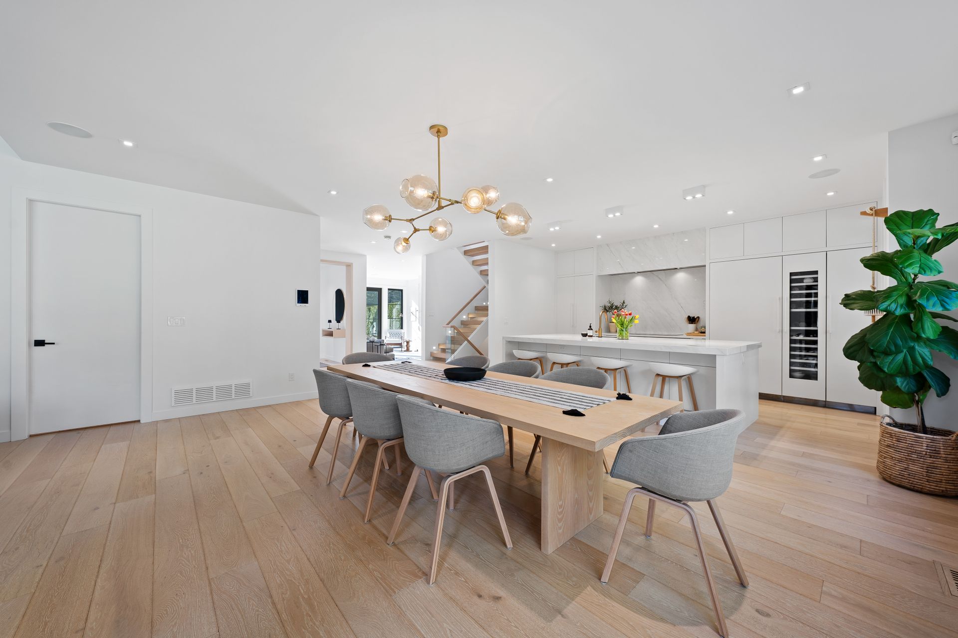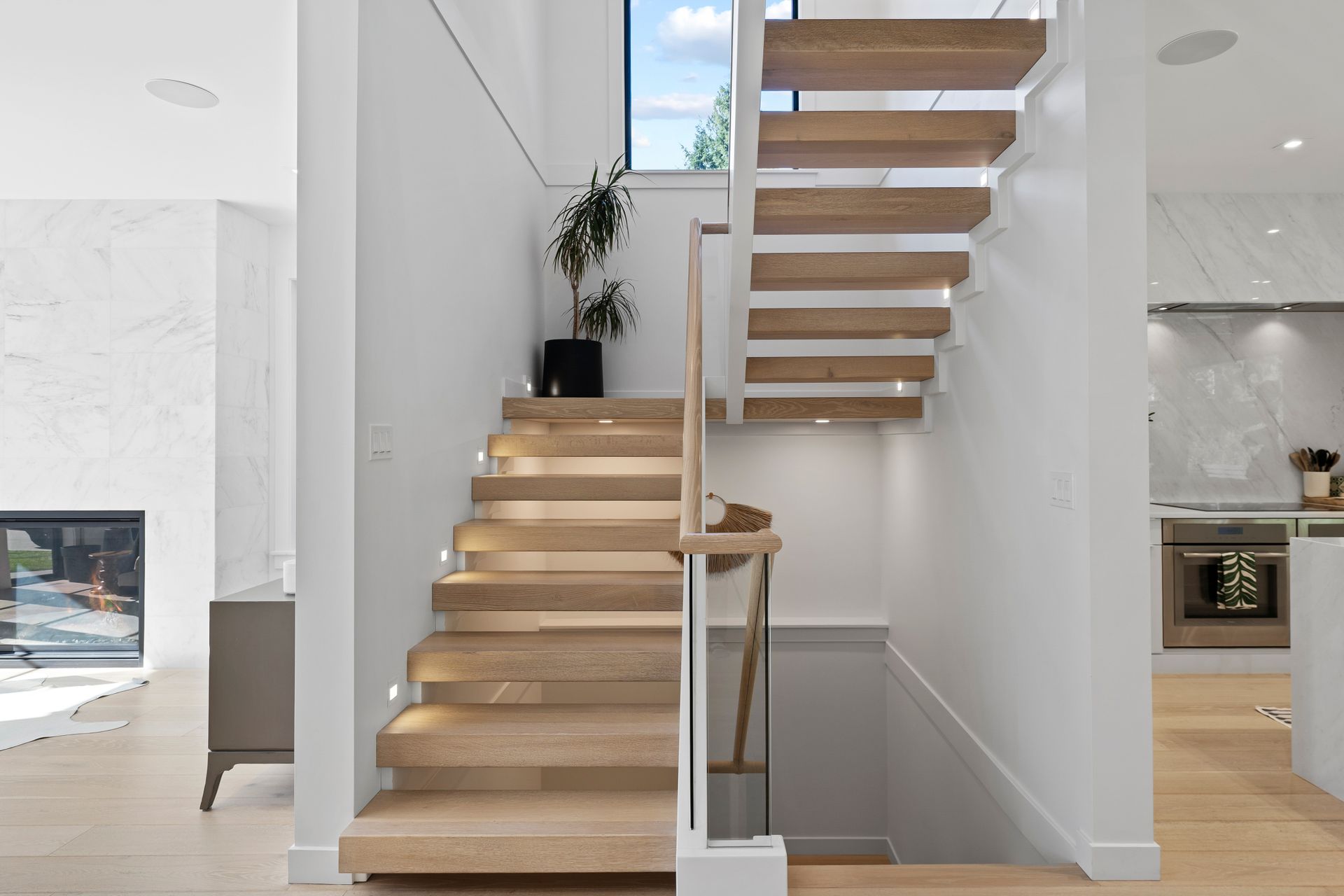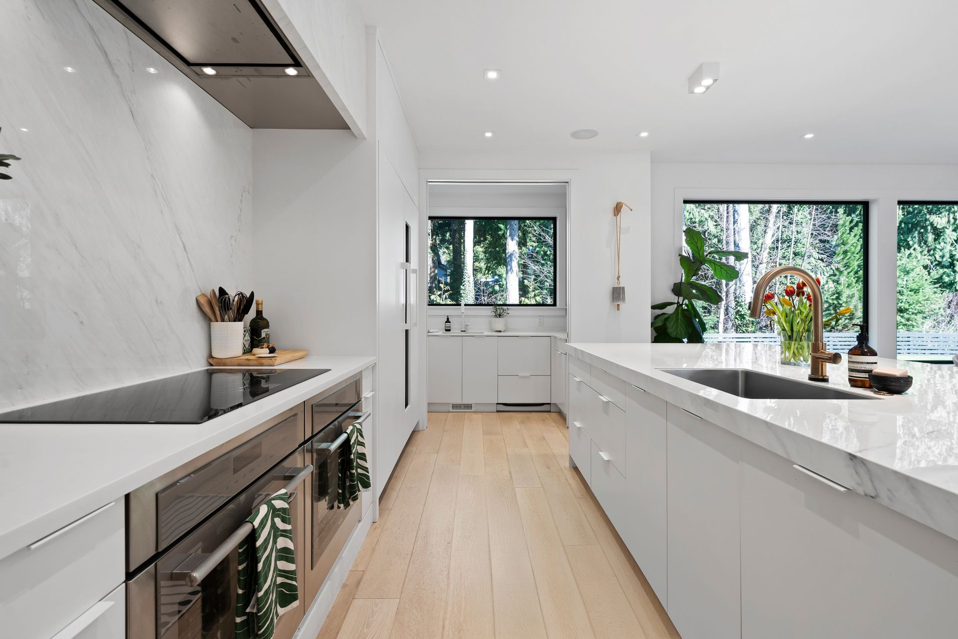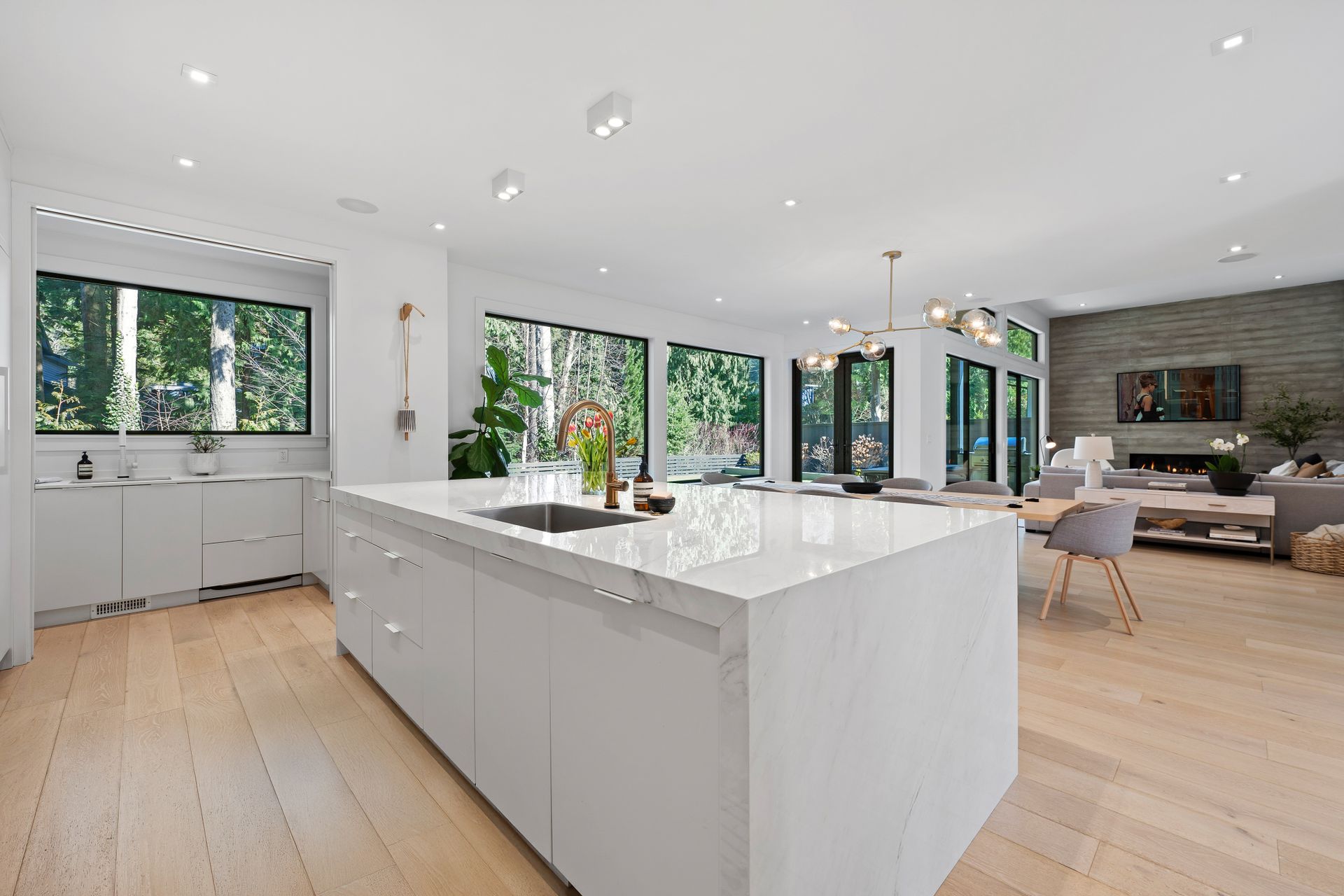 The main floor features a wonderful open plan kitchen with stunning porcelain island and matching backsplash, gleaming light oak floors throughout, plus a generous living room and den, plus an oversized family room. Two fireplaces on the main.