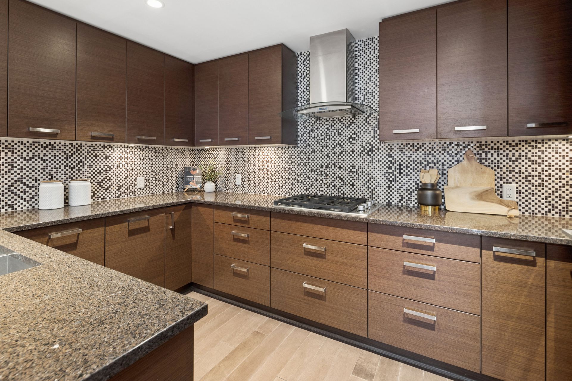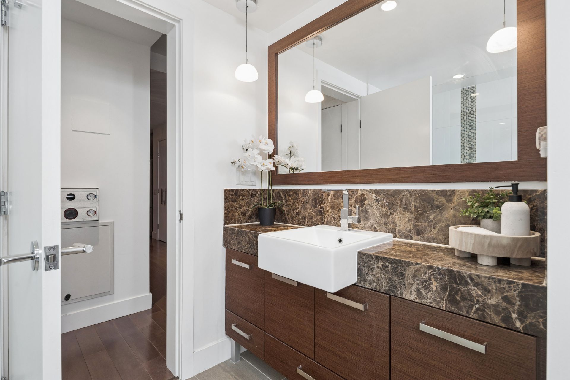 Welcome to The Kimpton in the heart of Central Lonsdale. This beautifully presented 1 bed + flex, 1 bath home offers 782 sqft of well-designed living with a quiet north-facing exposure. The open-concept layout features a house-sized kitchen with Fisher & Paykel appliances, granite countertops, European-style cabinetry, Italian Latorre faucet, and a generous breakfast bar flowing into the dining and living areas—ideal for entertaining. Enjoy in-floor heating, updated paint and LG washer/dryer (2023). The spacious flex is perfect for a home office. Spa-like bathroom with marble finishes and frameless glass shower. Includes 1 parking & 1 storage. Steps to shops, cafes, restaurants & transit—an exceptional opportunity in a sought-after location.